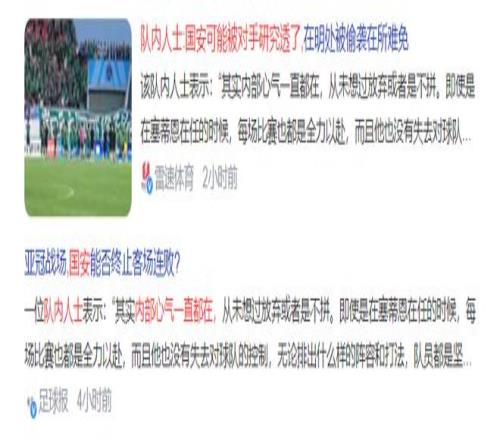 其中一位队内人士透露,北京国安内部心气一直都在,从未想过放弃或者是不拼,即使塞蒂恩在队时,每场比赛也是全力以赴,该人士还同时表示,北京国安之所以变成现在这样,可能是已经被对手研究透了,被针对了,因为北京国安以前都是以我为主,但是现在北京国安在明处,而对手则是在暗处,所以难免被偷袭。