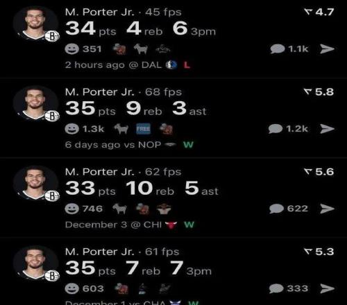 小波特是NBA历史上第一位连续4场比赛做到得分30+,5个3分以上的前锋,缩写也算是NBA历史第一前锋了