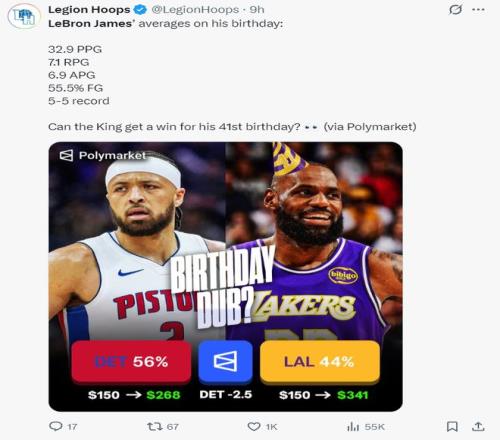 这场比赛是勒布朗-詹姆斯41岁的生日夜,詹姆斯生日夜场均32.9分7.1篮板6.9助攻,命中率55.5%,战绩是5胜5负,他是历史生日夜场均得分最高的球员。