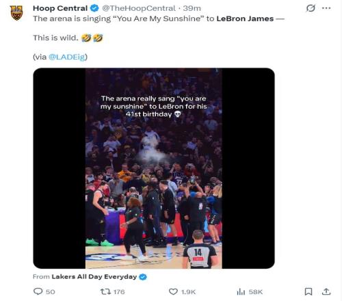 老詹41岁第一次抛镁粉,全场为他唱起《你是我的太阳》这首歌,用这首歌来为他庆祝生日,老詹头首节2中2拿到5分1篮板3助攻表现也不错。