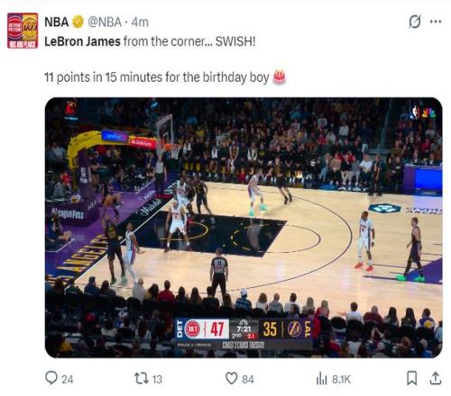 第二节老詹更是连续命中两个三分球,失去节奏的后仰三分都命中,随后还制造了坎宁安的一次三分犯规只可惜三罚两中,老詹外线再度命中一个三分球帮助湖人缩小分差,半场打完詹姆斯8中5+三分4中3+罚球5中2拿到15分1篮板4助攻1盖帽。