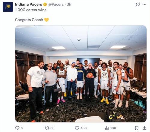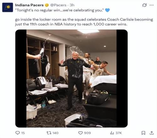 这场比赛的赛后步行者全队在更衣室疯狂为卡莱尔庆祝,他们都朝着卡莱尔浇水庆祝,全队都洋溢着喜悦的气氛,或许球队所有人都知道这个赛季他们是有意放弃的,卡莱尔的千胜来的迟了一点但虽迟但到。