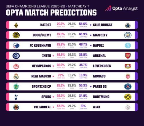 考虑到诸多因素,Opta的超级计算机为这场重头戏推演出了“势均力敌”的结果。国米主场赢球的概率达到36.9%,阿森纳则是36.8%,余下26.3%的模拟数据是平局。这里补充一句,联赛阶段还有两轮,枪手本轮的客场对手强,下轮要主场迎战的却是鱼腩——哈萨克斯坦球队阿拉木图凯拉特前6轮只拿到1分,打进4球但被破门15次。