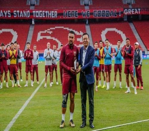 海港今日训练前,党总支书记沙良昌为李帅颁发百场纪念球衣 -